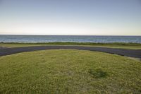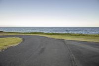 a empty road that runs along the shore with the water in the distance near a grassy field