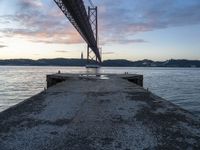 The break of day reveals the city of Lisbon, Portugal with its harbor, lake, beach, and jetty surrounded by the ocean, mountains, and sky. The morning sunlight bathes the asphalt, concrete, and wood surfaces and brings out the tints and shades of the calm coastal landscape.