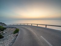 a curving curved curved road on the edge of water near an ocean at sunset time
