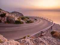 a curving road along the beach at sunset next to the water and a steep cliff