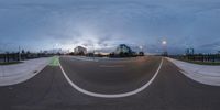 A scenic view of a road winding through the rural landscape of Markham, Ontario, Canada, with a beautiful dawn sky and a tranquil lake reflecting the grey clouds.