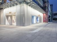 The modern architecture of the city of Shenzhen, Guangdong, China stands out against the dark night sky. Urban shop fronts, metal walls, glass windows, concrete pavers, and artificial lights create a unique atmosphere of a metropolitan area.