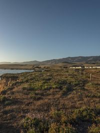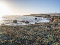 a grassy field by the shore and a cliff with rocks in the ocean in the background
