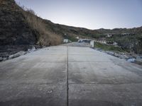 The early morning sun casts its light on the freezing mountain landscape of Portugal. The road winds its way through the terrain, running parallel to the coastline and ocean, with a boat ramp providing an entrance and exit to the highway.