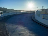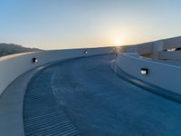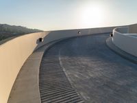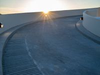 A one-quarter view of a residential driveway in Los Angeles, USA, with a sunny dawn sky casting hard shadows on the asphalt parking lot of a parking deck.