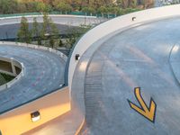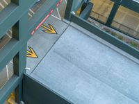 two yellow arrows pointing in opposite directions on a ramp, next to an alley way