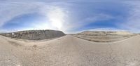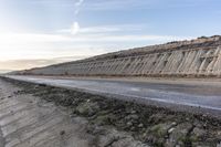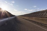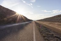 A picturesque view of a straight road stretching through the Monegros Desert in Bujaraloz, Zaragoza, Spain during dawn. The asphalt road glistens in the early morning light, with low water surface reflecting the clear sky. Contrails streak across the sky as the sun rises, casting a warm and sunny glow on the wet surface.