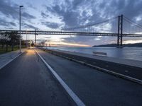 The clouds part at the break of day to reveal the azure sky and the city of Lisbon, Portugal in all its coastal glory. The horizon is illuminated by the first rays of sunlight, and the asphalt thoroughfare, electric infrastructure, and vegetation all work together to create an atmosphere of peace and tranquility.