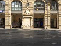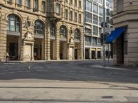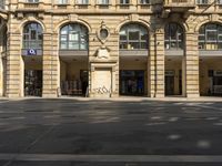 two buildings and people walking down the street next to the tram tracks is the corner of a large, busy city square