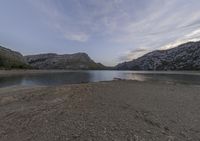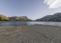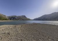 A picturesque view of Mallorca, Spain, in the Balearic Islands at daybreak. The landscape is full of natural resources such as mountains, lakes, rivers, and reservoirs, with black asphalt roads connecting the coastline and open space. The clear sky and sunny horizon give a calm atmosphere to the wild terrain of soil, grass, and rocks, with a mountain range in the background.