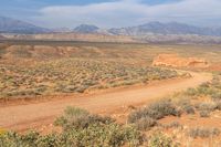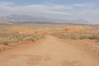A scenic view of the red rock desert landscape in Utah, USA. The image shows a dirt road cutting through the sandy terrain, surrounded by grass and vegetation. The rugged mountain formations and low-lying shrubs create a breathtaking natural environment.