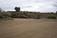 A scenic view of the red rock landscape in Utah, USA, with a straight road stretching through the desert under a gloomy grey sky. The sand street is framed by rock walls and mountains in the distance, showcasing the unique terrain and formations of San Rafael Swell.
