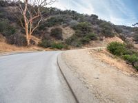 A winding asphalt road surrounded by gravel, dirt, and bush in the California desert on a sunny day.