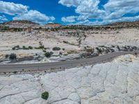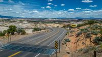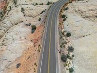 Located in the heart of Utah, the Head of the Rocks offers a breathtaking aerial view of the scenic landscape. A straight road stretches through the rural area, surrounded by vast nature and towering cliffs. From a high position, the road creates a striking visual as it cuts through the landscape, casting long shadows on the asphalt. The top-down perspective captures the beauty of this elevated road, showcasing the unique combination of nature and man-made infrastructure.
