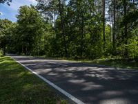A straight road stretches down the landscape, with hard shadows cast by the trees in the Berlin forest on a clear day.