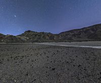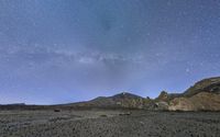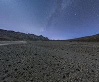 The Milky Way and stars illuminate a rugged off-road track in the open desert, creating a dramatic and emotional landscape of nature beneath a clear night sky.