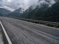 A tar-covered road winds straight down the mountain slope, guarded by an Armco barrier, in the dramatic and grey-skied Austrian highland landscape. Trees and cloud cast a gloomy atmosphere over the parallel thoroughfare, and the infrastructure creates a freezinig mode of transport.