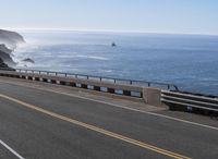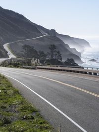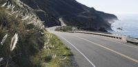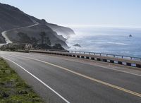 A car driving along the winding S-curve of the Pacific Coast Highway in Big Sur, California, USA. The road is surrounded by Armco barriers, the coastal terrain and clear sky providing a picturesque landscape of mountains, cliffs, forests, and a reservoir in the distance.