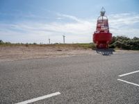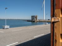 A scenic view of a windmill, a road, a street light and a pier near a lake and vegetation in the Netherlands during a clear day. A car is parked on the asphalt road surface and a wind turbine is in the background against the cumulus sky.