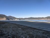 The break of day brings a low, coastal mountain range to life, casting a hard shadow over the lake and shore as the clear blue sky reveals the sound of sea and snow in the natural environment.