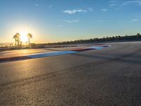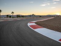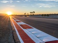 The sun is visible on the horizon as the race cars speed around the curve on the asphalt road at the break of day, bringing sunshine to the USA racing track.