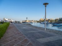 Along Egypt's stunning coastline, a picturesque marina and jetty welcome visitors to the harbor at dawn. The open space by the water features a pier and boat ramp, perfect for exploring the clear skies and tranquil ocean views. Pavers line the surface as boats gently sway against the backdrop of the African coast. This coastal oasis offers a serene break of day, ideal for a peaceful retreat by the sea.