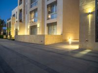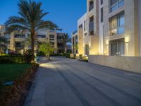 In a residential area of Egypt, the roads stretch straight down under the clear sky, illuminated by artificial light at night and the break of day at dawn. Palm trees line the pavers, casting shadows in the alleyways. The open spaces between homes provide a glimpse of the African urban design, with one-quarter of the scenes bathed in light and the rest in darkness, creating a unique play of light and shadow.