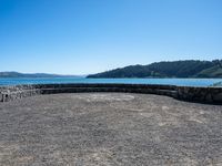 A breathtaking view of a clear sky and coastal landscape in New Zealand. The open space and elevated position provide a stunning perspective on the natural beauty of this coastal region near Wellington. The dirt and gravel surface adds a rustic charm to the scene, while the sparkling ocean water adds a touch of serenity.