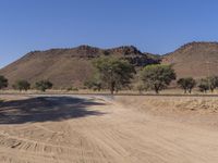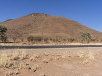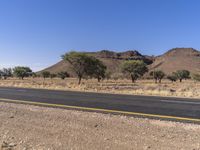 An asphalt road cutting through the vast African desert, with dirt and gravel on the sides, surrounded by a barren landscape of mountains and plains under a clear sky.
