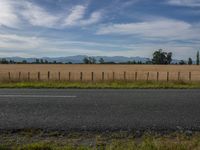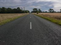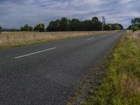 A straight road stretches endlessly through a rural landscape with grassy fields, trees, and a cloudy sky.
