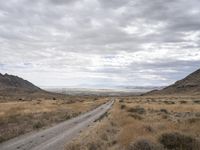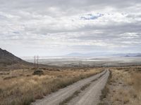 The winding road of Salt Lake City, Utah, USA, stretches out with an endless view of the dryland and farm fields, with a grey sky, mountain landforms, and a transmission tower in the background. The asphalt thoroughfare, surrounded by grass and vegetation, follows the curves of the valley as it winds its way through the natural environment and rural landscape.