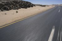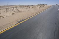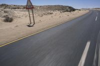 An asphalt road stretches endlessly through the desert landscape of South Africa, with mountains in the distance and clear blue sky above.