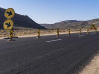 several traffic cones are lined up along the road and on the ground are yellow signs