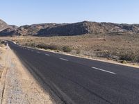 A scenic view of an endless road in South Africa, surrounded by a beautiful desert landscape and mountains. The road surface is made of smooth asphalt, leading towards the horizon with clear blue skies and lush vegetation.