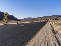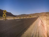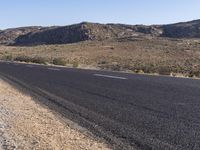 an empty highway on the road next to mountains and sand areas with trees in the background