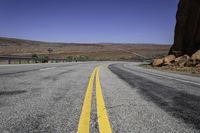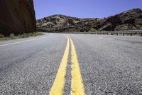 A low angle view of an endless road cutting through the red rock landscape of Utah, USA. The road surface is asphalt, surrounded by grass, trees, and vegetation. The clear sky and distant horizon create a sense of vastness and open space.