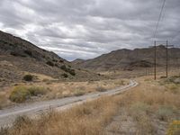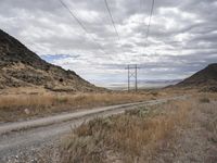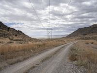A stretch of gravel road winds its way through the vast Utah wilderness, past mountains, grassy steppes, and highlands. With a grey sky overhead and an electricity transmission tower in the distance, this is an endless expanse of natural environment leading to the city of Salt Lake City.