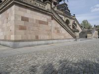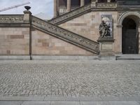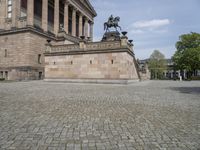 An aerial view of the Alte Nationalgalerie in Berlin, Germany. The classic architecture of the estate is highlighted by a cobble stone driveway, a beige stone wall, and a symmetrical view of the courtyards. The cityscape of the neighborhood is visible in the background, with trees and shrubs in the foreground.