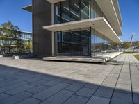 A modern condominium building in Lisbon, Portugal, surrounded by trees, clouds, and public spaces. Sunlight illuminates the flooring, asphalt road surface, and composite material facade creating a unique urban design with hard shadows and open spaces.