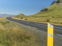 A road winds through a highland landscape of grass, trees, and vegetation in Iceland. The road's surface of asphalt, dirt, and gravel is illuminated by the bright sunlight and crystal clear sky.