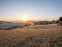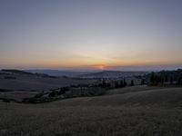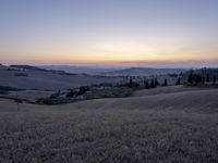 A beautiful evening in the mountains of Tuscany, Italy, illuminated by the golden afterglow of the setting sun. The rugged terrain is covered in a blanket of snow, with the horizon stretching across a vast open space of rolling hills, fields, and tree-covered wilderness. The distinct rural atmosphere of the area is highlighted by the clear sky above, with a few wispy clouds, making for a picturesque, idyllic winter landscape.