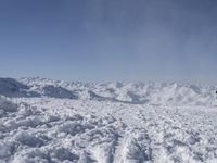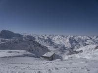 A gondola overlooks the frozen landscape of the moraine, nunatak, and piste of the French Alps. The winter sun shines down on the icy terrain, creating a view of the highlands, mountains, and valleys below.
