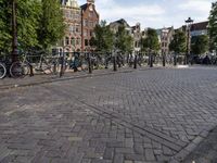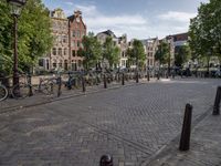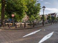 The iconic skyline of Amsterdam, the Netherlands, Europe, is composed of classic architecture, urban design, land vehicles, bicycles, and vegetation. City life is evident in the restaurants, residential areas, and infrastructure along the roads and thoroughfares, illuminated by street lights and the natural light of the sky.