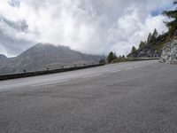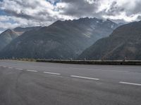 a person riding on a motorcycle down a highway under a cloudy sky and mountains with a road going up