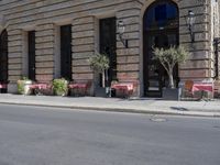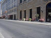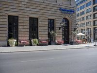 A tourist exploring a residential area of downtown Berlin, Germany on a sunny day. The classic architecture of the area is visible, with low houses, iron walls, and a pink facade with windows. A restaurant is visible in the background, with a road surface of asphalt, lane, and curb.