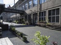 A classic Land Rover Defender parked in front of a colorful graffiti wall in a Berlin apartment complex's courtyard. The cobblestone driveway and yellow wood bench create a beautiful contrast to the city's industrial architecture and urban design.