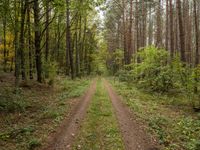 A winding road, full of gravel and sand, meanders through a deciduous forest showcasing the lush terrestrial plants, trees, and groundcover of Germany's capital city, Berlin, Europe in autumn.