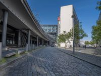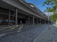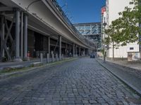 a cobble - stone road in front of an elevated bridge and building on the left, there is no traffic on the side