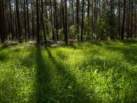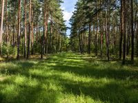 A dirt grass road leads straight down the road towards a lush forest landscape in Berlin, Brandenburg. The evergreen and deciduous trees provide shade and vegetation, with roadside grass and groundcover. An incidental person can be seen in the profile, exploring the open space and wetland of this woody plant paradise.
