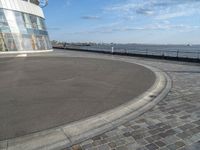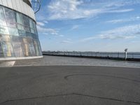 The city of Bremerhafen, Germany is featured in this black-and-white image, with its modern urban design, infrastructure, and high-rise buildings set against the backdrop of the azure lake and the clear sky. The wide asphalt thoroughfare, cobble stone curbs, and the pier in the harbor provide an atmosphere of business, city life, and coastal exploration.